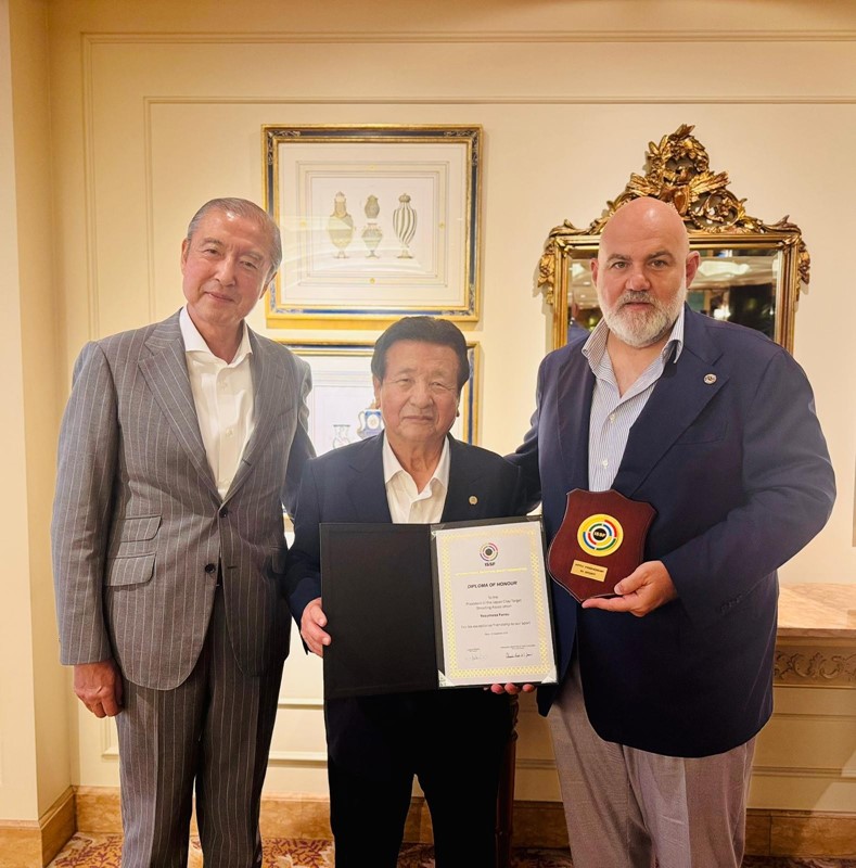ISSF事務総長と松丸氏は続いて日本クレー射撃協会会長の不老安正氏を訪問し、射撃競技への貢献に対してISSF名誉証書を授与しました。また、日本ライフル射撃協会国際関係責任者の佐々木詩子氏にも同様の証書を授与しました。